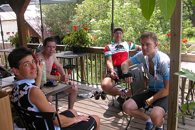 Mile 77! Left to right, Virginia of Cinder Track Bicycles, & Brian, Steve, and Thomas riding with the Sullivan County Bike Club, taking a well-deserved break on the deck at Pepacton Natural Foods, before the last leg of their 116-mile ride. August 11, 2007.