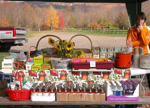 Fellow cyclists always welcome! In fact, we cater to cyclists: there's always free chilled water from our Brita pitcher, bathroom facilities, plus the deck to take a break and eat your lunch or snack on, overlooking the sparkling Downs Brook flowing past.October 20, 2007 - Jesse staffs our table at LibertyBikeTrail.org's Family Bicycling Day at Walnut Mountain in Liberty. If you missed it, ya shoulda been there: it was a beautiful day - free admission, great mountain biking, amazing scenery (and FREE knock-your-socks-off organic fair trade coffee and intense, creamy organic hot chocolate donated by Pepacton Natural Foods and LibertyBikeTrail.org, respectively)! There were also hot mulled cider and lots of tasty snacks at reasonable prices to keep everyone riding hard. And Virginia & Charlie of Cinder Track Bicycles were there with bikes to rent and on-site tech help. The folks at LibertyBikeTrail.org are knocking themselves out here in the Catskills to promote all kinds of cycling for everyone. Visit their site, and please set aside the day for their next event!